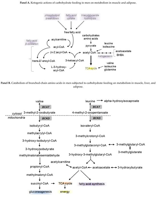 Effects of feeding different levels of dietary carbohydrate to men on metabolism. Serum metabolites in the same male subjects (n = 9) after consuming low (35 g), moderate (125 g), or high (350 g) daily intake of carbohydrates for 3-week periods (diets described in Table 2). Panel A illustrates how the low-carbohydrate diet induced a ketogenic response of lipid breakdown to liberate fatty acids for oxidation, ketogenesis, and the catabolism of amino acids to fuel the TCA cycle via acetyl CoA. Panel B represents the catabolism of branched-chain amino acids (BCAA) during a low carbohydrate diet. Panel C illustrates the catabolism of amino acids and their carbon skeleton to fuel the TCA cycle under a low carbohydrate diet (Watkins et al., 2014 [49]).