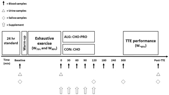 This study was conducted as a single-blinded randomised cross-over control study. The participants were blinded to the supplements provided. Subjects completed one session of physiological measures (i.e., a preliminary test), and two experimental interventions separated by approximately six days. Each experimental day consisted of an exhaustive cycling exercise bout (EX1) followed by 5 h of recovery, where the subjects were supplemented with the alginate CHO–PRO (ALG) or a control (CON) supplement in a randomised order. The supplements were given during the first 2 h of recovery. Water was provided ad libitum throughout the study. After 5 h of recovery, the subjects completed a time-to-exhaustion (TTE) performance test. The study’s protocol, including a timeline of its events, is described in Figure 1. Participants consumed a delivered standardised dinner in the evening, which was followed by an overnight fast prior to each experimental day. They were instructed to refrain from heavy and vigorous training on the day prior to the experimental day.
