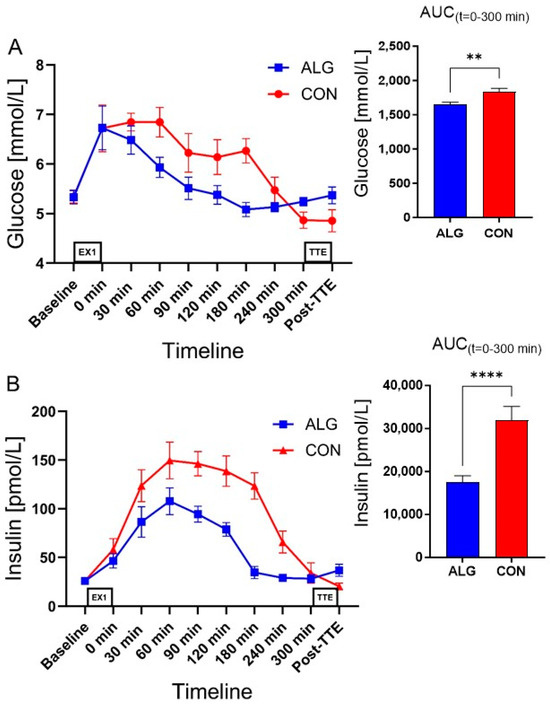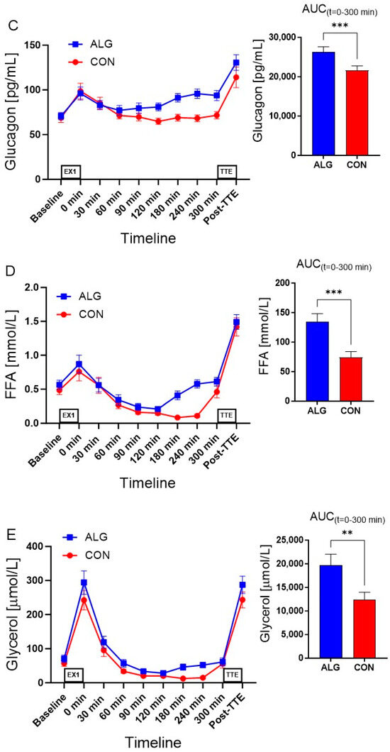 All data were tested for normal distribution with visual inspections (QQ plots) and by using D’Agostino and Pearson omnibus normality tests. Data that were not normally distributed were log-transformed and tested for normality. A two-tailed paired t-test was used for area-under-the-curve (AUC) analyses of the plasma glucose, insulin, FFAs, glucagon, glycerol, ammonia, CK, and plasma amino acids. A two-tailed paired t-test was also used for data analysis of the saliva samples (at all time points), EX1 exercise bout, TTE performance test, and urine samples, comparing ALG with CON. Data denoted with (¤) were statistically analysed with log data, but shown with raw data. Differences were considered significant when p ≤ 0.05. Statistical analyses were performed using GraphPad Prism 10.1.0. All following data are presented as the mean ± SEM, if otherwise not specified.