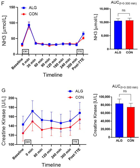 Time-dependent changes in the plasma concentrations of glucose, insulin, glucagon, free fatty acids, glycerol, ammonia, and creatine kinase throughout the clinical trial and area under the curve during the recovery period for ALG and CON. Levels of (A) glucose; (B) insulin; (C) glucagon; (D) free fatty acids; (E) glycerol; (F) ammonia (NH3); and (G) creatine kinase are given. Data are presented as their mean ± SEM. ** p < 0.01; *** p < 0.001; **** p < 0.0001; ns: not significant.