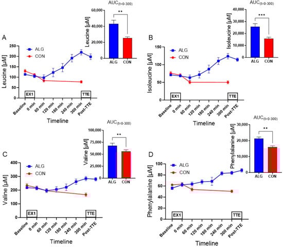 The levels of plasma branched-chain amino acids (BCAAs) decreased significantly after the first exhaustive exercise bout before the intervention (leucine: p = 0.0003, isoleucine: p = 0.02, valine: p = 0.04, comparing baseline vs. t = 0). BCAA levels increased after intake of ALG but decreased with the ingestion of CON. Furthermore, plasma EAA levels increased after intake of ALG compared to CON, and the mean AUC was significantly higher with ALG vs. CON for all essential amino acids, except for tryptophan, although it had a tendency toward statistical significance (p = 0.054) (Table 1, Figure 4). With regard to non-essential AAs (NEAAs), the mean AUC was significantly higher after the ingestion of ALG vs. CON for arginine (p = 0.006), tyrosine (p = 0.005), serine (p = 0.009), glutamine (p = 0.048), alanine (p = 0.02), asparagine (p = 0.03), ornithine (p = 0.007), and cysteine (p = 0.04), but not for the rest (Figure S1, Supplementary Materials).