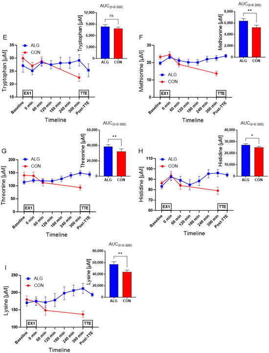 Plasma essential amino acid concentrations during the clinical trial and areas under the curve during the recovery period for ALG and CON supplements. The AAs measured were (A) leucine; (B) isoleucine; (C) valine; (D) phenylalanine (E); tryptophan; (F) methionine; (G) threonine; (H) histidine; (I) lysine. ALG: time points = 8, CON: time points = 4. Data are presented as their mean ± SEM. N = seven subjects. * p ≤ 0.05; ** p < 0.01; *** p < 0.001; ns: not significant.