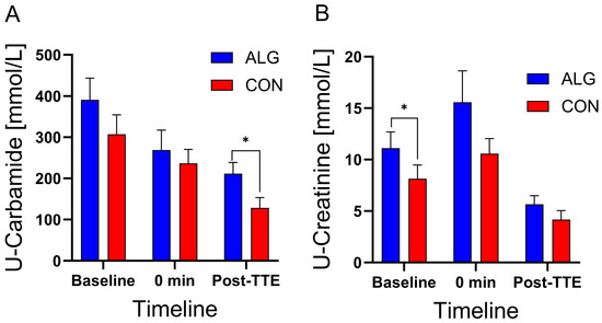 Urine (A) carbamide and (B) creatinine levels during the clinical trial for ALG vs. CON. Data are presented as their mean ± SEM. *: p ≤ 0.05.