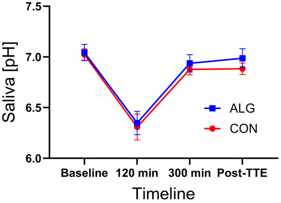 U-carbamide concentrations were significantly higher after the TTE performance test when ingesting ALG compared to CON (p = 0.013, Figure 5A). There was a tendency for differences to appear at baseline (p = 0.053), but no differences at t = 0 (p = 0.4) appeared between the supplements. In contrast, U-creatinine concentrations were significantly different between supplements at baseline (p= 0.02), whereas there were no statistical significant differences at t = 0 (p = 0.10 (¤)) nor at the post-TTE time point (p = 0.13) when comparing ALG with CON (Figure 5B). Moreover, there were no significant differences in the pH values of the subjects’ saliva between ALG and CON (Figure 6).