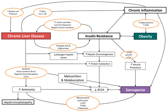 Ammonia, a product derived through protein catabolism and intestinal bacterial metabolism, is physiologically transferred via portal circulation to the liver, where it is converted to urea via the hepatic urea cycle, and finally excreted by the kidneys. In liver disease, the urea cycle efficacy is reduced, mainly because of enzymatic dysfunction and cofactor deficiency (such as zinc), with a consequent increase in the serum ammonia levels. A further increase in ammonia serum levels in cirrhosis is due to porto-systemic shunts, through which gut ammonia flow directly into the systemic circulation, bypassing liver detoxification. The serum ammonia is then picked up by skeletal muscle, where it is detoxified to glutamate/glutamine by the citric acid cycle. The augmented amounts of ammonia entering the cycle display various effects, favoring sarcopenia: mitochondrial dysfunction, with increased oxidative stress, impaired energy production and lipid oxidation, ending in fat accumulation; depletion of substrates (BCAAs) for muscle protein synthesis [11,47,79]; and transcriptional upregulation of myostatin, a TGF-β superfamily member that reduces muscle protein synthesis, finally leading to muscle cells destruction [80,81]. Indeed, increased myostatin levels have been related to muscle wasting, reduced functional liver reserve and overall survival in cirrhotic patients [82,83]. In turn, sarcopenic patients, due to the loss of muscle mass, have a reduced ammonia detoxification capacity, leading to an increase in ammonia levels in both serum and the brain and a higher risk of encephalopathy [80,84] due to several mechanisms: an increase in the passage of aromatic amino acids (tryptophan, phenylalanine and tyrosine) across the blood–brain barrier, leading to an imbalance that favors inhibitory neurotransmitters [85]; direct activation of the GABAergic system and ammonia accumulation in astrocytes, determining intracellular edema [86].