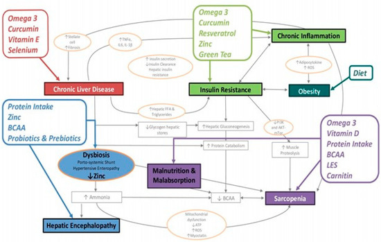Zinc: Zinc plays a pivotal role in most metabolic and immunologic pathways, being an essential cofactor for the catalytic domain of more than 300 enzymes. Zinc deficiency characterizes advanced stages of liver disease, being detected in almost 50% of cirrhotic patients and in up to 90% of those with albumin serum levels < 3.5 g/dL [123]. In cirrhotic patients, many mechanisms contribute to reduced zinc levels, namely, nutritional deficiency, decreased intestinal absorption, porto-systemic shunts, decreased hepatic extraction and, most of all, hypoalbuminemia, as albumin-free zinc is lost into the urine. In addition, muscle catabolism, together with the use of diuretics that inhibit renal tubular reabsorption of zinc, increase its renal excretion [123,124,125]. Zinc deficiency can cause a wide range of symptoms, including appetite loss, body hair loss, impaired taste and smell, atrophy of testis, cerebral and immune dysfunction and impairment of drug excretion ability. Zinc also plays a key role in the regulation of insulin secretion and activation, and its deficiency contributes to impaired glucose tolerance [125]. In the liver, zinc exerts certain functions that are not replaceable: the urea cycle, through which ammonia is converted into the non-toxic metabolite urea and is catalyzed by zinc-containing enzymes; if zinc deficiency occurs, ammonia processing is reduced, thus increasing the risk of toxicity [124]. Furthermore, zinc depletion contributes to the development of hepatic fibrosis by triggering collagen synthesis by stellate cells and altering the degradation of the extracellular matrix by zinc-dependent enzymes. Indeed, some studies demonstrated that zinc supplementation can improve hepatic fibrosis [126]. Finally, zinc deficiency has been associated with liver carcinogenesis and has been identified as an independent prognostic factor in patients with early HCC due to viral hepatitis treated curatively [127,128]. Zinc is also crucial in the crosstalk between the liver and muscles, and low zinc levels independently predict sarcopenia and frailty in patients with liver cirrhosis due to a mechanism mediated by the increase in circulating ammonia [125,129]. In obesity, zinc deficiency is associated with inflammation, oxidative stress and both lipid and glucose metabolism impairment [130], with zinc supplementation shown to improve body weight management [131].