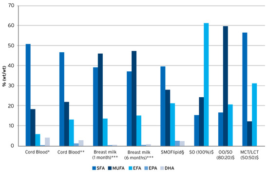 SMOFlipid is a composite ILE containing SO (30%), MCTs (30%), OO (25%), and FO (15%), and is supplemented with alpha-tocopherol (200 mg/L) to counteract lipid peroxidation and oxidative stress [22]. A key feature of SMOFlipid is its specific fatty acid pattern resulting from the combination of these four different oils. In comparison to SO, SO/MCT, or OO/SO-based ILEs, the pattern is more similar to human umbilical cord blood and breast milk, respectively, with regard to proportions of saturated fatty acids, monounsaturated fatty acids, EFAs, and the omega-3 PUFAs EPA and DHA (Figure 1) [71,72,73]. Such a balanced fatty acid supply is of relevance, especially for newborn infants, to maintain plasma and tissue fatty acid patterns equivalent to those seen in breast-fed infants [31].