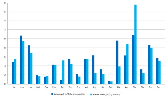 Vaminolact is a pediatric amino acid solution providing essential (49%) and non-essential (51%) amino acids in a pattern similar to human milk (Figure 2). The amino acid composition of Vaminolact has a special focus on amino acids that are critical for pediatric patients (Table 2). It supplies adequate amounts of cysteine and tyrosine to compensate for the insufficient synthetic capacity in newborn and young infants. Moreover, it provides higher amounts of arginine to account for reduced intestinal synthesis and lower amounts of methionine, phenylalanine, valine, and isoleucine to account for the lack of intestinal “first-pass” metabolism [54,55,56]. This helps to avoid plasma amino acids imbalances in pediatric patients receiving PN.