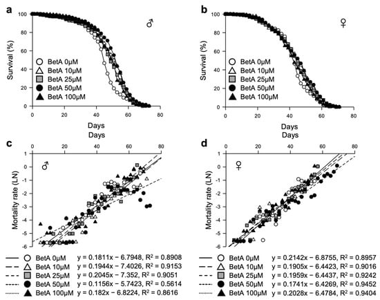Effect of BetA on the lifespan of fruit flies. (a,b) Effect of BetA on the lifespan of males (a) and females (b). (c,d) Mortality curves of male (c) or female (d) flies supplemented with control or BetA. The natural log of the mortality rate was plotted using the Gompertz mortality model. BetA: Betulinic acid.