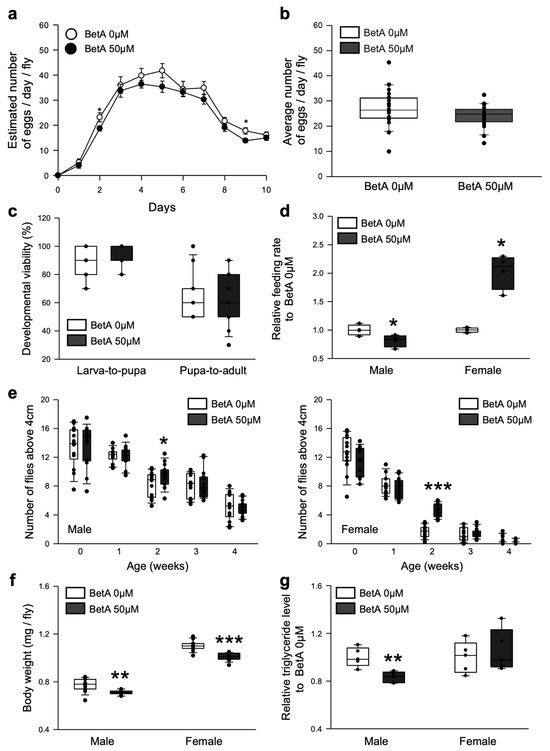 Fecundity: Male and female fruit flies were collected separately every three hours after initiating the first eclosion. Female virginity was confirmed by the absence of progeny in the food after 24 h. The Φ25 × 100 mm vials were set up on day two, with a population density of two males and one virgin female. Every 24 h, the flies were transferred to new vials containing fresh SY food with/without 50 μM BetA. The number of eggs laid by each female daily was counted for 10 days. Twenty replicate vials were tested per treatment (total no. flies = 20). The statistical probability was determined using a t-test.
