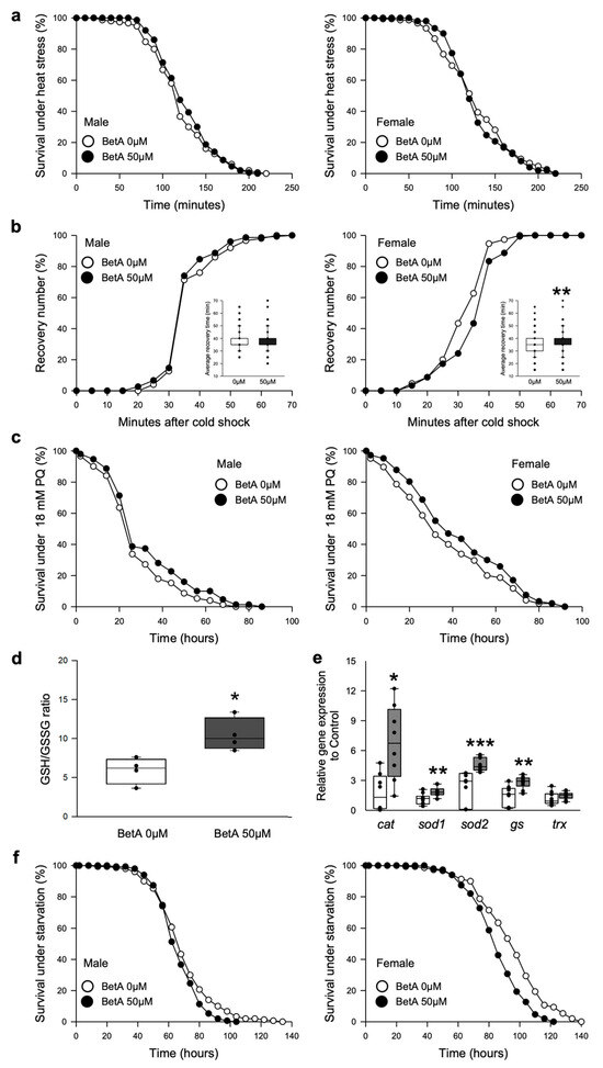 Many pharmacological interventions used for their anti-aging effects increase the resistance to environmental stresses [17,18]. A recent study showed that supplementation with BetA increased the resistance to various environmental stresses in C. elegans [10]. To confirm that the beneficial effects of BetA against various stressors were conserved in the current organism model, the effects of BetA treatment on stresses, including heat shock, cold shock, oxidative stress, and starvation stress, were investigated (Figure 4). In our study, the BetA-treated flies did not show increased resistance to heat shock (Figure 4a, male, log-rank test, p = 0.4370; female, log-rank test, p = 0.5567). Under cold shock stress, the recovery time was unaffected in males (Figure 4b left, t-test, p = 0.1329) but was delayed in females after the BetA treatment (Figure 4b right, t-test, p < 0.001). Similar to the results of previous studies, the BetA treatment enhanced the resistance to oxidative stress in fruit flies (Figure 4c, males, log-rank test, p < 0.05; females, log-rank test, p < 0.05). The ratio of reduced glutathione (GSH) to oxidized glutathione (GSSG) within cells is a measure of cellular oxidative stress wherein a lower GSH-to-GSSG ratio is indicative of greater oxidative stress and the increase in GSH-to-GSSG ratio is indicative of resistance to oxidative stress. The BetA treatment resulted in an increase in the GSH-to-GSSG ratio and the gene expressions of antioxidant enzymes (Figure 4d,e). However, the BetA-treated fruit flies were more sensitive to starvation stress (Figure 4f, males, log-rank test, p < 0.05; females, log-rank test, p < 0.0001).