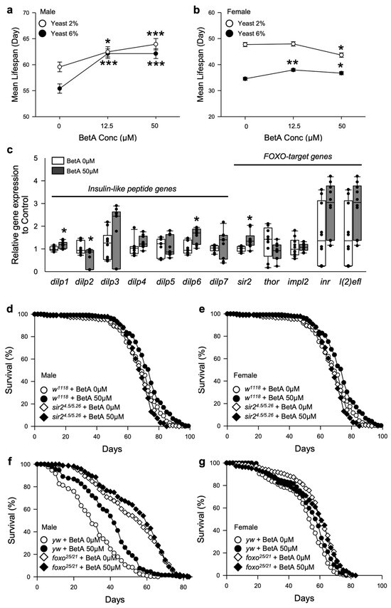 These features have also been observed in organisms with dietary restriction (DR). DR is the most effective intervention to induce longevity and provide a healthy lifestyle in all model organisms [19,20]. Several anti-aging agents have been reported to extend the lifespan of organisms via the regulation of mechanisms related to DR [21]. To determine whether the effects of BetA on longevity are related to DR, fruit flies were fed BetA in 2 or 6% of the brewer’s yeast diet media (Figure 5a,b and Figure S2 and Table S4). Interestingly, the BetA treatment still increased the lifespan of male flies even on a restricted diet (2% yeast diet) compared to the control group (Figure 5a, Table S4, 6% yeast, vs. 0 μM; 12.5 μM, 12.14% increase, p < 0.0001; 50 μM, 12.14% increase, p < 0.0001; 2% yeast, vs. 0 μM; 12.5 μM, 4.88% increase, p < 0.05; 50 μM, 7.34% increase, p < 0.0001), but did not affect or decreased the lifespan of female flies under the DR diet (Figure 5b, Table S4, 6% yeast, vs. 0 μM; 12.5 μM, 9.88% increase, p < 0.005; 50 μM, 6.27% increase, p < 0.05; 2% yeast, vs. 0 μM; 12.5 μM, 0.52% increase, p = 0.6183; 50 μM, 8.52% decrease, p < 0.05). These results suggest that the longevity effect of BetA is dependent on sex-specific differences and partially acts like DR.