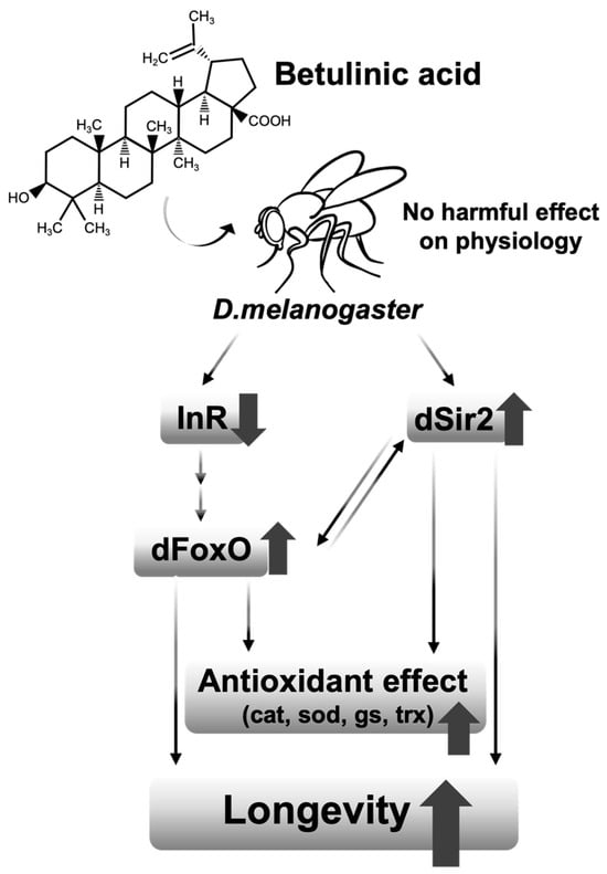 Understanding the biological basis of aging and the potential effect of natural compounds such as BetA on lifespan holds promise not only for extending human lifespan but also for enhancing the overall quality of life during aging. Furthermore, exploring the mechanisms underlying the effects of BetA on longevity could offer valuable insights into the fundamental biology of aging and provide a basis for developing novel interventions to address the anti-aging effect. BetA is a natural compound found in the bark of several tree species, including the white birch tree, eucalyptus, plane trees, and mistletoe, as well as in certain fruits like berries [3,24,25]. BetA has been used as a traditional medicine for various diseases, and recently its effects on longevity were proven in C. elegans. However, there is still a lack of evidence on the effect of BetA on longevity in other organism models, and its mechanism remains unknown. In this study, we showed that treatment with BetA extended the lifespan of fruit flies without any adverse effects on physiological functions.