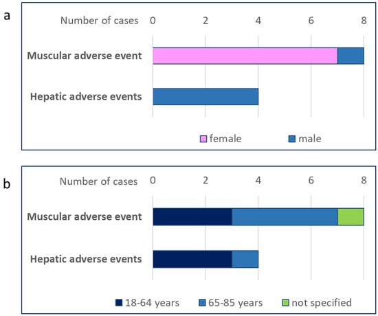 Four cases of hepatobiliary disorders associated with RYR use were also reported. More specifically, hepatic cytolysis was reported in three cases and liver injury in one case (Table 1). Of note, we also found one case of transaminase elevation in a person with hepatitis B taking RYR. All of these adverse events occurred in men, four of whom were aged <65 years old (Figure 1a,b). Supplementary Table S2 shows the distribution of the individual adverse events by gender and age. The analysis of data from FAERS revealed a total of 28,133 cases of hepatobiliary disorders, as defined for this analysis, from 2013 onward (the date of the first report for RYR); thus, cases of liver disorders attributable to RYR use accounted for 0.014%.