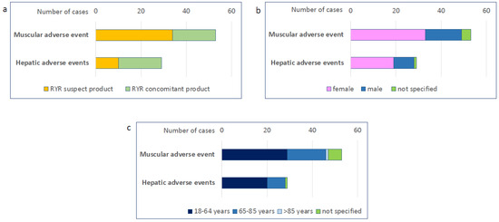 As of June 2023, a total of 1,301,786 cases of adverse events were reported in the CAERS database. We identified a total of 223 cases of adverse events in people taking RYR. These included 53 cases of muscle-related adverse events and 29 cases of liver-related adverse events. In 34 cases of muscle-related adverse events and 10 cases of liver-related adverse events, RYR was reported as the suspected product, while in all other cases it was reported as a concomitant product (Figure 2a). Most adverse events occurred in women (Figure 2b) and in people aged 18–64 years (Figure 2c).