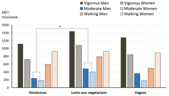 Level of physical activity (vigorous, moderate, or walking) performed by the participants according to dietary group and gender. Median values are shown. Omnivores, n = 92, lacto-ovo vegetarians, n = 96, and vegans, n = 112. * Significantly different compared to omnivores. Men performed significantly higher vigorous activity (p = 0.046) and less walking than women (p = 0.013). Kruskal–Wallis and Mann–Whitney tests.