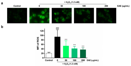 To assess the protective effects of EAE on H2O2-induced ROS production in HaCaT cells, we examined intracellular ROS production by utilizing DCFH-DA. Intracellular ROS levels were visualized using fluorescence microscopy (Figure 2a) and quantified using ImageJ software v.1.52 (Figure 2b). The highest fluorescence intensity was observed in the H2O2 treatment group compared to the control, indicating that H2O2 induced intracellular ROS production. However, pre-treatment with EAE (50, 100, 200 µg/mL) significantly decreased intracellular ROS production in a concentration-dependent manner.