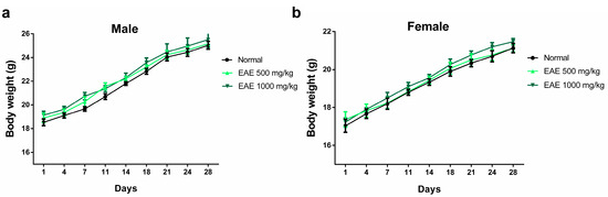 Effect of repeated 28-day oral dosing of Erigeron annuus extract (EAE) on body weight in (a) male and (b) female mice. The normal group treatment (distilled water) and EAE (500 and 1000 mg/kg) were administered orally. There was no significant (p > 0.05) difference in body weight between the three groups.