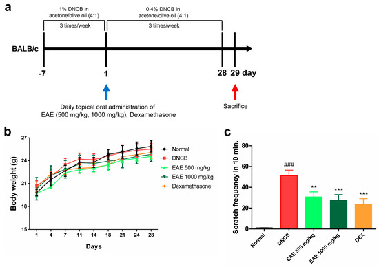 After the mice were acclimatized for one week, DNCB (1-chloro-2,4-dinitrobenzene, Sigma-Aldrich, St. Louis, MO, USA) was dissolved in an acetone–olive oil suspension (4:1) at a concentration of 1% and applied to the right ear three times a week. Thereafter, they were sensitized with a 0.4% DNCB solution three times a week while on EAE and dexamethasone. An acetone–olive oil (4:1) suspension without DNCB was applied to the normal group. The mice were grouped into the normal group (normal), DNCB group (DNCB), EAE 500 mg/kg group with DNCB, EAE 1000 mg/kg group with DNCB, and DNCB group with dexamethasone (DEX). Each group consisted of six mice. The EAE 500 mg/kg and 1000 mg/kg groups received EAE diluted in sterile distilled water to 500 and 1000 mg/kg, respectively, which was administered orally daily. The DEX group received dexamethasone diluted to 1 mg/kg in distilled water, which was administered orally daily. The control and DNCB groups received distilled water orally daily.
