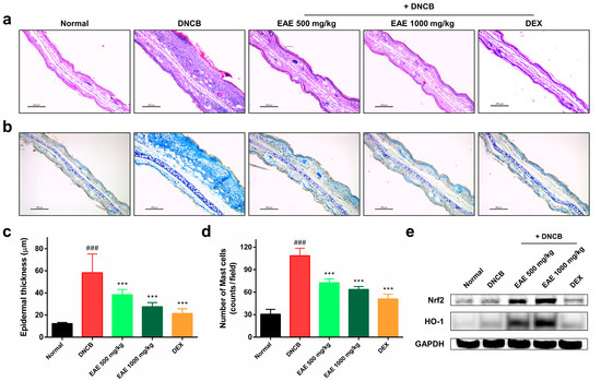After all the experiments were completed, the mice were euthanized, and an ear tissue slide was prepared. H&E staining was performed to measure ear epithelium thickness. Epidermal thickness was determined using ImageJ software. Repeated application of DNCB to the mouse ear skin resulted in hyperkeratosis and an increase in the epidermal thickness of the ear, which was significantly reduced by EAE treatment in a concentration-dependent manner (Figure 5a,c). We conducted toluidine blue staining to visualize the infiltration of mast cells. The number of infiltrating mast cells in the dermal layer increased after repeated DNCB application. Treatment with the EA extract significantly reduced mast cell infiltration in a concentration-dependent manner (Figure 5b,d). Western blotting was performed to investigate the effects of EAE on the Nrf2/HO-1 signaling pathway in DNCB-induced AD mice. Dexamethasone, a corticosteroid, did not significantly change the expression of Nrf2 and HO-1. In conversely, EAE treatment resulted in a significant dose-dependent increase in Nrf2 and HO-1 expression (Figure 5e). These results demonstrate that the antioxidant and anti-inflammatory effects of EAE are exerted by activating the Nrf2/HO-1 pathway.