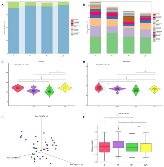 The abundance and diversity of microbiome in fecal samples. (A) The relative abundance of the top 20 microbes at phylum level; (B) The relative abundance of top 20 microbes at genus level; (C) Chao1 diversity index of gut microbiota in mice of C, YP, SPI, and WPI groups; (D) Shannon diversity index of gut microbiota in mice of C, YP, SPI, and WPI groups; (E) Bray–Curtis PCoA of gut microbiota in C, YP, SPI, and WPI gavage mice; (F) Bray–Curtis distance of gut microbiota between the three protein groups and the control group. n = 10. C, control; YP, yeast protein; SPI, soybean protein isolate; WPI, whey protein isolate. Pairwise p values are calculated using the nonparametric Kruskal–Wallis test with Tukey’s post-hoc test. PCoA, principal coordinate analysis; PERMANOVA, permutational multivariate analysis of variance. ns, not significant; *, p < 0.05; **, p < 0.01.