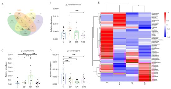 The Venn and relative abundance of each taxonomic genus in different dietary proteins. (A) The unique OTUs among groups; (B–D) Representative significantly changed gut microbes at genus levels; (E) Heatmap of the top 50 abundant genera in the gut microbiota. n = 10. C, control; YP, yeast protein; SPI, soybean protein isolate; WPI, whey protein isolate. **, p < 0.01.