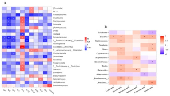 Significant correlations analysis. (A) Significant correlations among genera with cytokine, immunoglobulin, and antioxidant. (B) Significant correlations between genera and SCFAs. n = 10. IgA, immunoglobulin A; IgG, immunoglobulin G; IgM, immunoglobulin M; IL-4, interleukin-4; IL-6, interleukin-6; IL-10, interleukin-10; TNF-α, tumor necrosis factor -α; MDA, malondialdehyde; SOD, superoxide dismutase; CAT, catalase; GSH-Px, glutathione peroxidase. *, p < 0.05; **, p < 0.01, ***, p < 0.001. Without unidentified and unclassified OUTs.