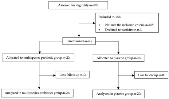| Characteristics | Multispecies Probiotic (n = 20) | Placebo (n = 20) |