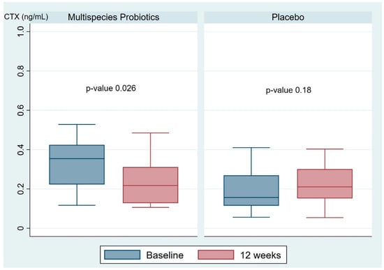 | CTX (ng/mL) Baseline a 12 weeks a Mean difference a | 0.33 (0.12, 0.53) 0.24 (0.11, 0.49) −0.06 (−0.29, 0.05) | 0.23 (0.56, 0.75) 0.26 (0.54, 1.00) 0.04 (−0.45, 0.67) | 0.004 * 0.90 <0.001 * |