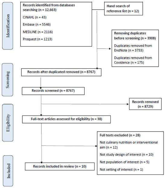 A total of 12,675 articles were retrieved using the search strategy (Supplementary Table S1). Once duplicates were removed, 8675 articles were single screened by title and abstract in Covidence [17] (CTC, AP, CE). The eligible 38 full-text articles were double screened (CTC, AP). We excluded 28 full-text articles due to them being: not an aim of interest (n = 12), not a study design of interest (n = 10), not a population of interest (n = 5) and not a setting of interest (n = 1). A total of ten eligible studies had data extracted for this scoping review [19,20,21,22,23,24,25,26,27,28], which included a total of nine culinary nutrition interventions (as one intervention was published across two articles [20,21]). The Preferred Reporting Items for Systematic reviews and Meta-Analyses (PRISMA) flowchart (Figure 1) reports the flow of records into the review (Figure 1).