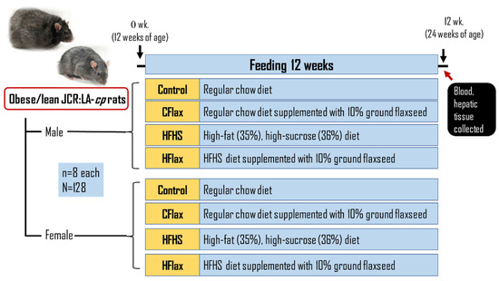 Male and female obese JCR:LA-cp rats and their genetic control lean JCR:LA-cp rats were randomized into groups (n = 8 each) to receive, for 12 weeks, either (a) control diet (Con), (b) control diet supplemented with 10% ground flaxseed (CFlax), (c) a high-fat/high-sucrose (HFHS) diet, or (d) HFHS supplemented with 10% ground flaxseed (HFlax). Prolab® RMH 3000 (TestDiet, Richmond, IN, USA) regular rodent chow was the control diet. The HFHS diet from TestDiet, Richmond, IN, USA contained AIN-93G chow with 35% fat (lard) and 36% carbohydrate (mostly sucrose). BakePur milled flaxseed was gratefully received from Pizzey Ingredients, Russell, Manitoba, Canada. The rats were allowed ad libitum access to water and food. Food intake was measured daily and averaged to obtain weekly values. Body weights were weighed weekly. The dietary protocol was completed at 12 weeks when the JCR:LA-cp rats were 24 weeks old, Figure 1. The nutritional composition of all of the experimental diets (ash, protein, fibre, carbohydrate, protein, fat, energy) has been reported previously in detail [13]. Body weights for all groups throughout the course of the study have also been reported previously [13].