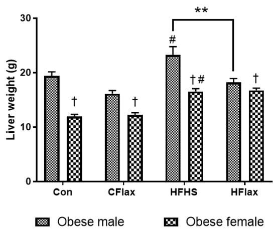 Effect of diet and sex on liver weight. All values presented are mean ± SE. # p < 0.05 versus Con diet. ** p < 0.01 versus JCR rats on the HFHS diet. Con: control diet; CFlax: flaxseed-supplemented diet; HFHS: high-fat, high-sucrose-supplemented diet; HFlax: high-fat, high-sucrose and flaxseed-supplemented diet; † p < 0.05 versus respective male JCR rats on the same diet, two-way ANOVA. N = 8.