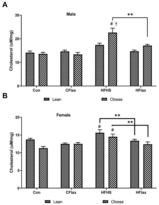 Hepatic total cholesterol as a function of the dietary interventions in lean and obese male and female JCR:LA-cp rats. All values presented are mean ± SE. (A) Hepatic cholesterol in male animals and (B) hepatic cholesterol in female animals. CFlax: flaxseed-supplemented diet; HFHS: high-fat, high-sucrose-supplemented diet; HFlax: high-fat, high-sucrose and flaxseed-supplemented diet; ** p < 0.01 versus respective JCR rats on different diets, two-way ANOVA. † p < 0.05 versus respective JCR rats on the same diet, two-way ANOVA. # p < 0.05 versus JCR rats on the control diet, two-way ANOVA. N = 8.