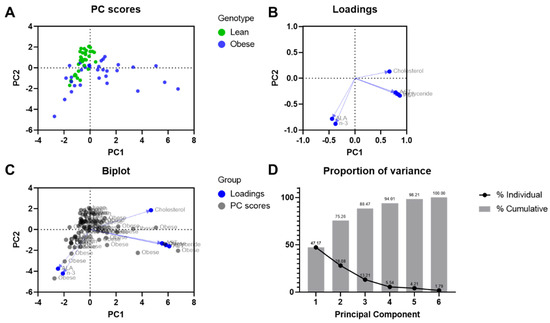 Principal component analysis on biochemical parameters. (A) Scores plot; (B) loadings plot; (C) biplot; and (D) proportion of variance plot.