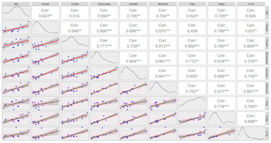 Figure 2. Chart of correlations, density curve, and regression models of anthropometric measures of the sample (* p ≤ 0.050; ** p ≤ 0.010; *** p ≤ 0.001).