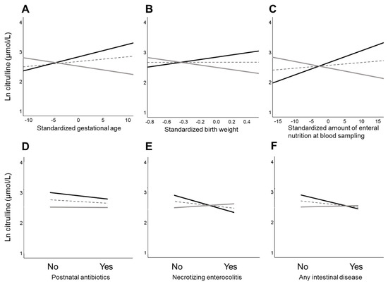 Relationships between clinical variables and citrulline levels at Early and Late postnatal ages. Relationships between gestational age (A), birth weight (B), amount of enteral nutrition at blood sampling (C), use of postnatal antibiotics (D), incidence of necrotizing enterocolitis (E), any intestinal diseases (F), and citrulline levels at Early (one standard deviation below the mean) and Late (one standard deviation above the mean) postnatal ages. Regression lines between clinical variables and blood citrulline levels are shown for Early (solid gray line), Late (solid black line), and mean (dotted line) postnatal ages using simple slope analysis. Continuous variables (gestational age, birth weight, and the amount of enteral nutrition at the time of blood sampling) were mean centered for convenience.