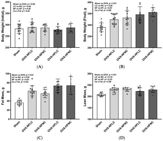 There were no differences in initial body weight between LC and NC or between NF and HF groups (Figure 1A). Compared to the NF diet, consuming the HF diet increased body weight (Figure 1B, main effect fat: p < 0.01) and fat mass (Figure 1C, p < 0.01) but not lean mass (Figure 1D, p = 0.33). Dietary Ca content did not affect either body weight (main effect Ca: p = 0.28), fat mass (p = 0.52), or lean mass (p = 0.19). There were no significant interactions between dietary Ca and dietary fat for body weight, fat, or lean mass. Pooled OVX groups had greater body weight (p < 0.01), fat mass (p < 0.01), and lean mass (p < 0.01) at the end of the study than those of sham rats.