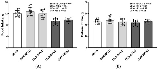Food intake and energy intake did not differ between the LC and NC groups (Figure 2A,B). Food intake by animals fed the HF diet was less than those fed the NF diet (main effect Fat: p < 0.01). However, total energy intake was the same between the NF and the HF groups (Fat: p = 0.19) due to the greater energy content of the HF diet (3.85–3.89 vs. 4.73–4.80 kcal/g for the NF and HF diet as calculated, respectively). Food intake (p = 0.06) and energy intake (p = 0.79) did not differ between Sham and pooled OVX groups.