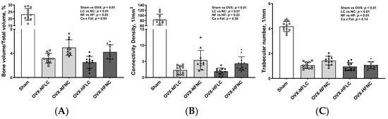 Changes of trabecular bone at the proximal tibia (Figure 3) and cortical bone (Figure 4) at the mid-diaphysis of the tibia in response to dietary Ca and fat were evaluated using a non-destructive μCT instrument. Compared to NC, LC resulted in lower BV/TV (main effect Ca: p < 0.01), Conn.Dn (p < 0.01), Tb.N (p = 0.01), BMD (p < 0.01), and greater Tb.Sp at the proximal tibia. Compared to rats on the NF diet, animals fed HF had lower BV/TV (main effect fat: p = 0.03) and Tb.N (p < 0.01) with greater Tb.Sp (p = 0.01). As expected, OVX significantly negatively affected the trabecular bone structural parameters of the tibia. For example, trabecular bone volume and trabecular number decreased by 84% (p < 0.01) and 74% (p < 0.01), respectively, while trabecular separation increased by 330% (p < 0.01). Compared to Sham, OVX rats also had lower tibial Conn.Dn (p < 0.01) with greater SMI (p < 0.01). Cortical bone parameters were not changed by either dietary Ca, fat, or OVX procedure.