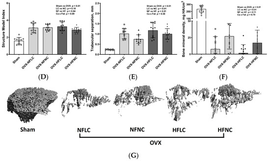 Proximal tibia trabecular BV/TV (A), Conn.Dn (B), Tb.N (C), SMI (D), Tb.Sp (E), BMD (F), and representative images (G) of Sham or OVX rats fed either a purified normal-fat (10% energy as fat) or a high-fat (45% energy as fat) diet containing 1 or 6 g Ca/4057 kcal for 4 months. Data are mean ± SD (n = 12 for each group except n = 11 for NFNC). The region of interest consisted of 100 slices scanned at 16 µm isotropic voxel size starting from about 1 mm distal to the growth plate for trabecular bone evaluation. The main effects of dietary fat and dietary Ca of OVX groups and their interaction were analyzed using the 2-factor ANOVA (JMP, version 17.0.0; SAS Institute, Inc., Cary, NC, USA). Tukey–Kramer post hoc contrasts were performed to compare group means if the dietary fat using dietary Ca interaction was significant. An a priori contrast was written to test whether the mean of the four OVX groups differed from the Sham. For all analyses, p < 0.05 was considered statistically significant. BMD, bone mineral density; BV/TV, bone volume/Total volume; Conn.Dn, connectivity density; HFLC, high-fat low-Ca diet (45% energy as fat, 1 g Ca/4057 kcal); HFLC, high-fat normal-Ca diet (45% energy as fat, 6 g Ca/4057 kcal); NFNC, normal-fat normal-Ca diet (10% energy as fat, 6 g Ca/4057 kcal); NFLC, normal-fat low-calcium diet (10% energy as fat, 1 g Ca/4057 kcal); OVX, ovariectomy (ovariectomized); Sham, Sham-operated; SMI, structure model index; Tb.N, trabecular number, Tb.Sp, trabecular separation; Tb.Th, trabecular thickness.