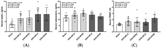 HF diet increased serum concentrations of leptin (Figure 5, p = 0.03), but not osteocalcin and TRAP. There were no differences in serum cytokine concentrations between LC and NC groups. Compared to Sham, OVX animals had greater serum concentrations of leptin (p < 0.01), osteocalcin (p < 0.01), and TRAP (p < 0.01).