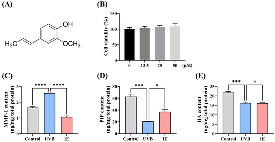 IE mitigates UVB irradiation-induced photoaging of Hs68 cells. (A) Chemical structure of IE. (B) Cell viability after 24 h incubation with 0 µM, 12.5 µM, 25 µM, and 50 µM IE. (C) MMP-1 contents. (D) PIP contents (represent the collagen contents). (E) HA contents. The data are presented as mean ± SEM (n = 3). Significant differences between the groups are indicated as * p < 0.05; *** p < 0.001; **** p < 0.0001; and ns, not significant (p > 0.05).