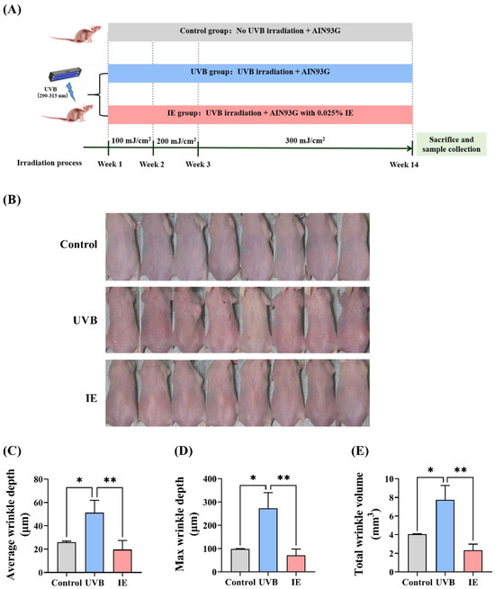 Dietary IE alleviates chronic UVB-triggered wrinkle formation in SKH-1 hairless mice. (A) An illustrative depiction of the experimental process. (B) Images depicting the dorsal skin of mice at the 14th week of the experiment. (C) Average wrinkle depth. (D) Maximum wrinkle depth. (E) Total wrinkle volume. The data are presented as mean ± SEM (n = 3–8). The significant differences between the groups are indicated as * p < 0.05 and ** p < 0.01.