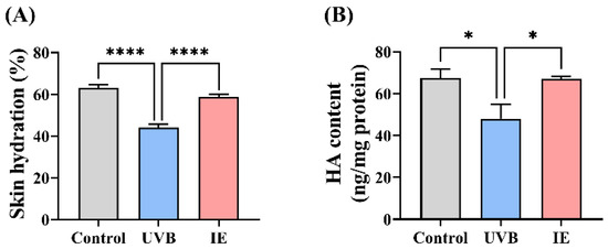 Skin hydration and HA levels were examined to evaluate the capacity of IE to improve skin dryness in chronic UVB-exposed mice. Prolonged exposure to UVB irradiation reduced skin hydration and HA content, while dietary IE restored these parameters compared to the UVB group mice, consequently alleviating skin dryness (Figure 3A,B).