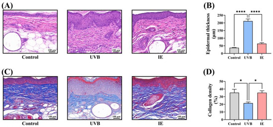 IE inhibits chronic UVB-induced epidermal thickening and collagen loss in the mouse skin. (A) Representative micrographs of skin sections stained with HE after 14 weeks of UVB irradiation (100×, scale bar = 100 µm). (B) Average epidermal thickness of the dorsal skin. (C) Representative micrographs of skin sections stained with Masson’s trichrome after 14 weeks of UVB irradiation (100×, scale bar = 100 µm). (D) Average collagen density of the dorsal skin. The data are presented as mean ± SEM (n = 3). The significant differences between the groups are indicated as * p < 0.05 and **** p < 0.0001.