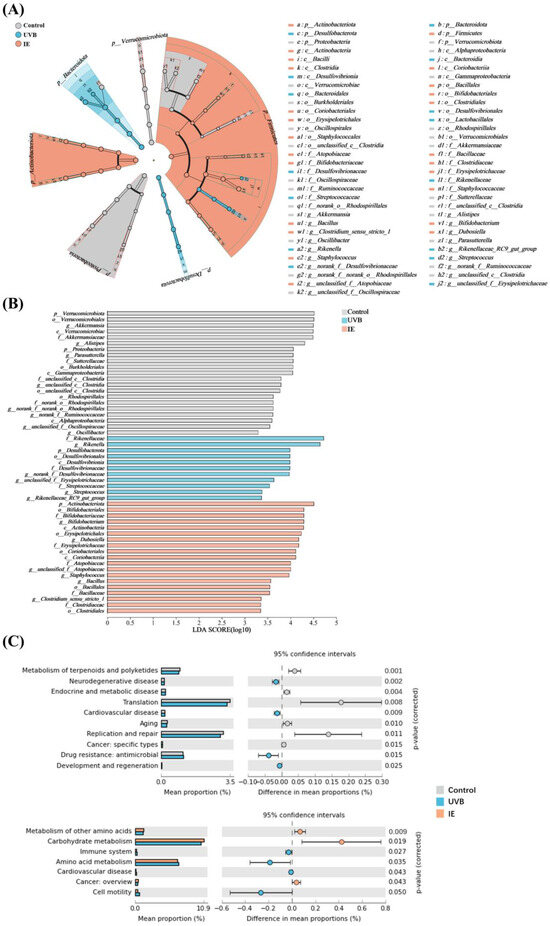 LEfSe analyses were performed to detect the distinctly abundant bacterial taxa in the three groups. At the ASV level, the LEfSe analysis was performed using a two-point scoring threshold. The distinctly abundant bacterial taxa of the control group mice were Verrucomicrobiota and Proteobacteria at the phylum level; Verrucomicrobia, Gammaproteobacteria, and Alphaproteobacteria at the class level; Verrucomicrobiales, Burkholderiales, unclassified_c__Clostridia, and Rhodospirillales at the order level; Akkermansia, Alistipes, Parasutterella, Parasutterella, unclassified_c__Clostridia, norank_f__norank_o__Rhodospirillales, norank_f__Ruminococcaceae, unclassified_f__Oscillospiraceae, and g__Oscillibacter at the genus level; and Akkermansiaceae, Sutterellaceae, unclassified_c__Clostridia, and norank_o__Rhodospirillales at the species level (Figure 6A,B). The distinctly abundant bacterial taxa of the UVB group mice were Desulfobacterota at the phylum level; Desulfovibrionia at the class level; Desulfovibrionales at the order level; Rikenellaceae, Desulfovibrionaceae, and Streptococcaceae at the family level; and Rikenella, norank_f__Desulfovibrionaceae, unclassified_f__Erysipelotrichaceae, Streptococcus, and Rikenellaceae_RC9_gut_group at the genus level (Figure 6A,B). The distinctly abundant bacterial taxa of the IE group mice were Actinobacteriota at the phylum level; Actinobacteria and Coriobacteriia at the class level; Bifidobacteriales, Erysipelotrichales, Coriobacteriales, Bacillales, and Clostridiales at the order level; Bifidobacteriaceae, Erysipelotrichaceae, Atopobiaceae, Bacillaceae, and Clostridiaceae at the family level; and Bifidobacterium, Dubosiella, unclassified_f__Atopobiaceae, Staphylococcus, Bacillus, and Clostridium_sensu_stricto_1 at the genus level (Figure 6A,B). To elucidate the changes in microbial community functionality following prolonged UVB irradiation and the IE intervention, the KEGG database was used for the 16S rRNA gene catalog annotation. Chronic UVB exposure upregulated neurodegenerative disease, cardiovascular disease, antimicrobial drug resistance, and the development and regeneration while downregulating terpenoids and polyketide metabolism, endocrine and metabolic disease, translation, aging, replication and repair, and cancer—specific types (Figure 6C). The IE intervention upregulated the metabolism of other amino acids, carbohydrate metabolism, and cancer (overview), and downregulated immune disease, amino acid metabolism, cardiovascular disease, and cell motility (Figure 6C).