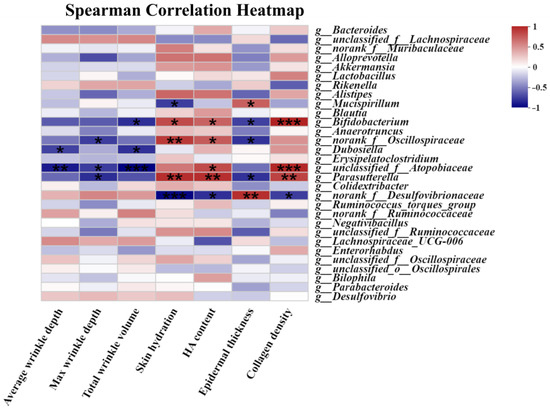 The correlation assessment between the relative abundance of gut microbiota and skin photoaging indices. Blue denotes a negative correlation, and red indicates a positive correlation. The significant differences between the groups are indicated as * p < 0.05, ** p < 0.01, and *** p < 0.001. n = 3.