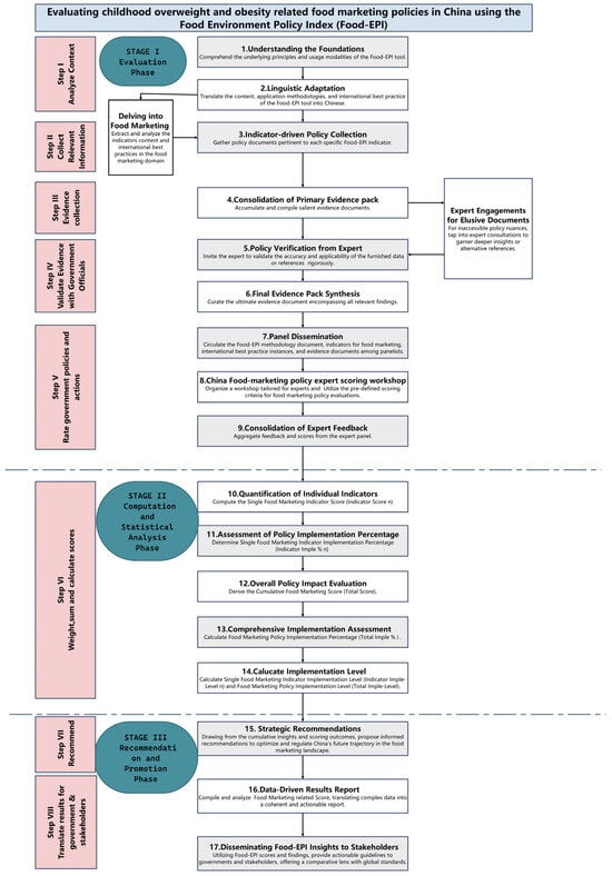 To critically appraise the design of food marketing policies in China, we derived 3 metrics including the Toal Food Marketing Score (Total Score), the Total Food Marketing Policy Implementation Percentage (Total Impl %), and the Total Food Marketing Policy Implementation Level (Total Impl-Level). Our evaluative framework and calculation process draws upon the octadic structure of the Food–EPI. For clarity and comprehensive understanding, we further demarcated these eight steps into three well-defined phases, encompassing a total of 17 distinct tasks, as shown in Figure 2.