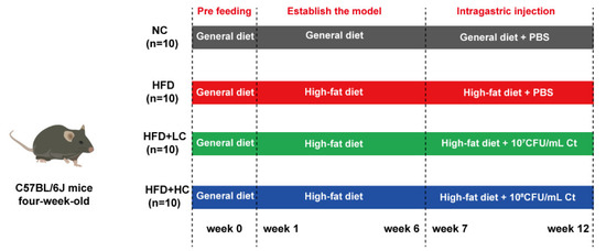 Schematic for the feeding experiment. Male C57BL/6J mice received the high-fat or general diet for six weeks to build the model. After that, the mice received phosphate-buffered saline (PBS), 107 CFU/mL Ct, or 108 CFU/mL Ct treatment by gavage in 0.2 mL volumes for six weeks.