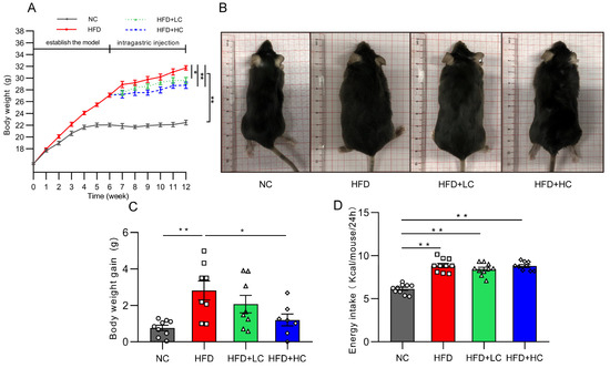 At the initial stage, there was no discernible difference between the groups in the change in body mass index (p > 0.05, Figure 2A). As expected, HFD induced significant gains in body weight from baseline. Thirty obese mice were chosen for the follow-up intervention trial after six weeks of the HFD challenge, and their average body weight was 22.2% greater than that of the NC group. Figure 2A,C shows that the weight gain of the NC group and of the HFD + HC group was considerably reduced compared to that of the HFD group during the Ct intervention period (p < 0.05). The above results indicate that the high-fat diet can significantly induce obesity in mice, and Ct has a certain alleviation effect on obesity induced by the HF diet, while the effect of high-dose Ct intervention is more prominent.